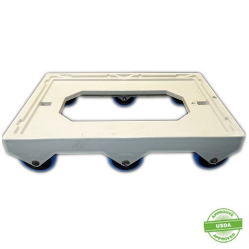 10 cm diameter PA wheels with rubber tyres so silent on any type of ground, no vibration, comfort of use, does not freeze in cold storage.